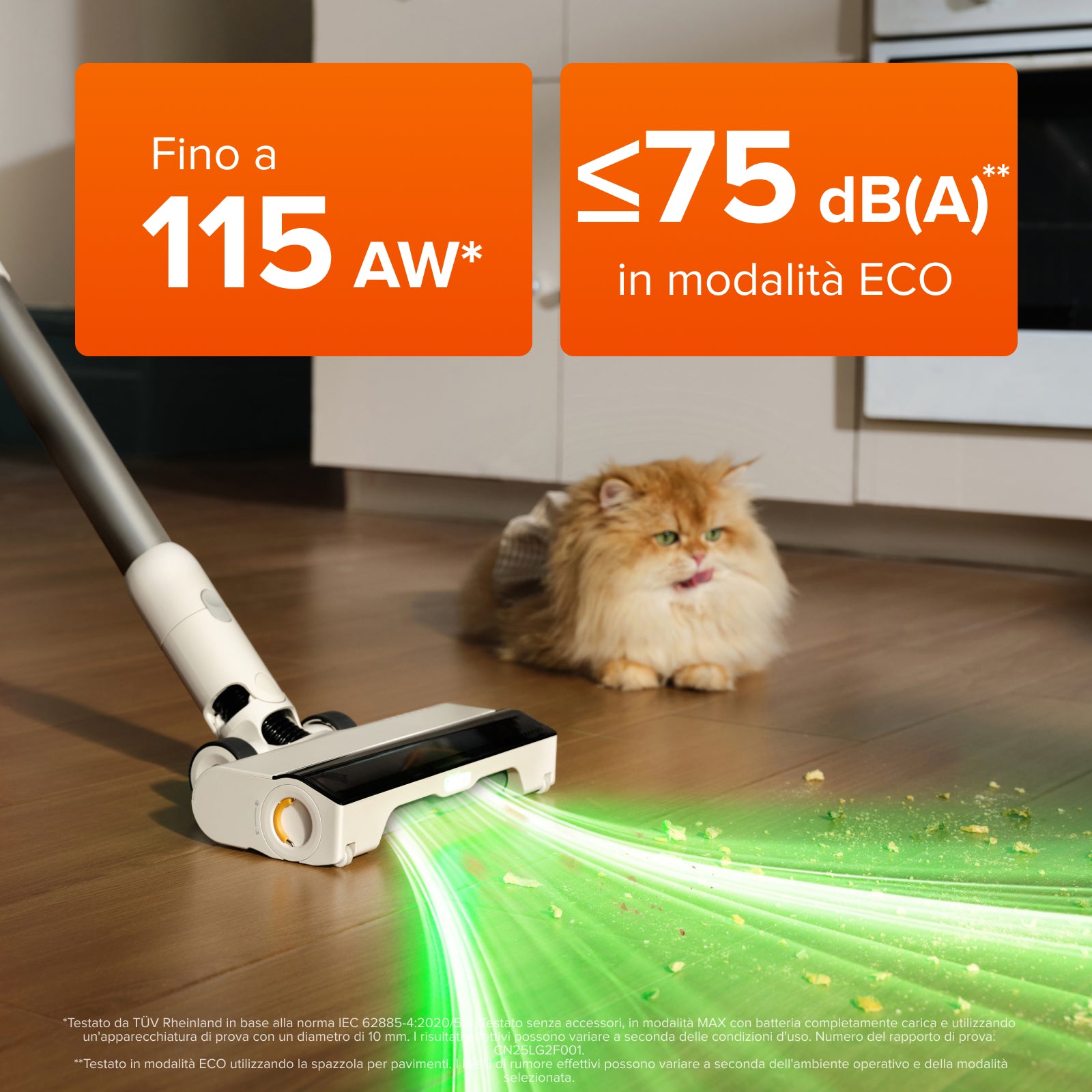 Con un'impressionante potenza di aspirazione massima di 115 AW, Roborock H60 Hub rimuove facilmente sporco, polvere e detriti da tappeti e pavimenti duri. Certificato da TÜV Rheinland3, le sue elevate prestazioni garantiscono una pulizia profonda e accurata ogni volta.
